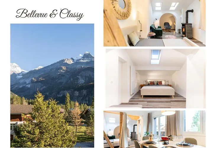 Bellevue & Classy Mountain View Apartment Kandersteg o powierzchni 65 m² wychodzi na górę i zapewnia gościom Wi-Fi oraz prywatny parking na terenie. Alpine Centre Kandersteg znajduje się zaledwie 600 m od tego apartamentu, natomiast Nature Park Blausee znajduje się 3 km od stąd.